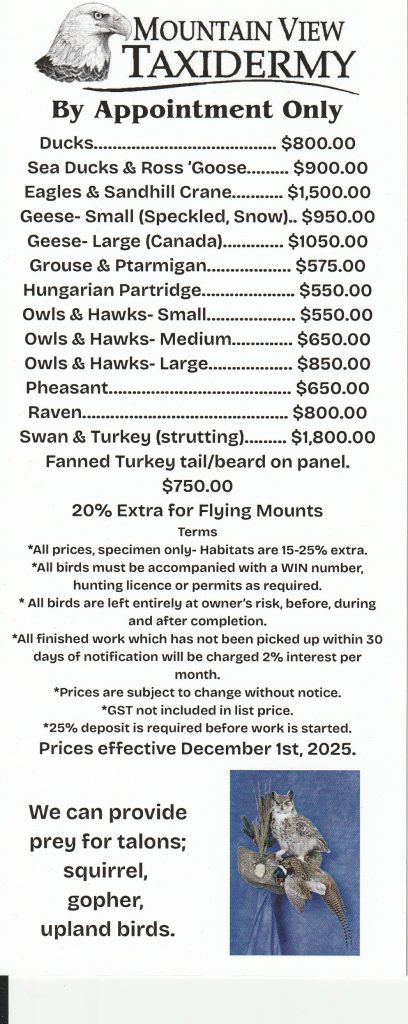 In 2020 we sold our studio building. We decided to continue working, but on a semi-retired scale, so we built a small studio in our back yard. We now specialize in birds only. If you would like to use our taxidermy service, we are now taking in work by appointment only. To set up an appointment, please call 403-556-6644. We will do our best to have your taxidermy work completed in 8-10 months.